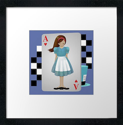 "Alice 3D Flying Cards" Art from 2016 "Alice: 3D Flying Cards" iPad app icon. Alice appears in a Wonderland abstract on a 3D card (Ace of Hearts), with references to a chess board and original John Tenniel depiction of the Mad Hatter's hat. Vector art, digital painting, plus my own textures. Created in Adobe Photoshop. Copyright © 2016 Audra D. Lemke. |