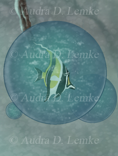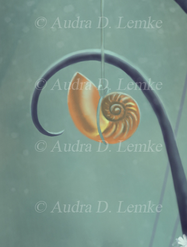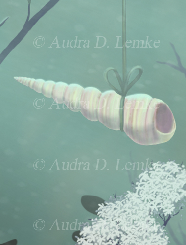 "Keepsakes of the Ocean" DETAIL IMAGES: "Boy swimming out of ocean portal", "Hummingbird collector carrying shell", "Green Bulb Kelp, red fish, and tang", "Moorish idol in small portal bubble", "Dead mans fingers kelp", "Red coral", "Shell: copper spiral", "Shell: cone spiral" A boy emerges from a portal to bring ocean gifts to a collector in the forest. Is the child visiting from a sea far away? Or are the precious ocean keepsakes lost relics from another time? Protect our oceans! (Copyright © 2013 Audra D. Lemke). |