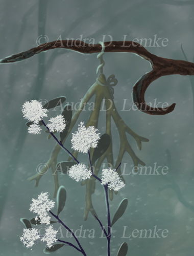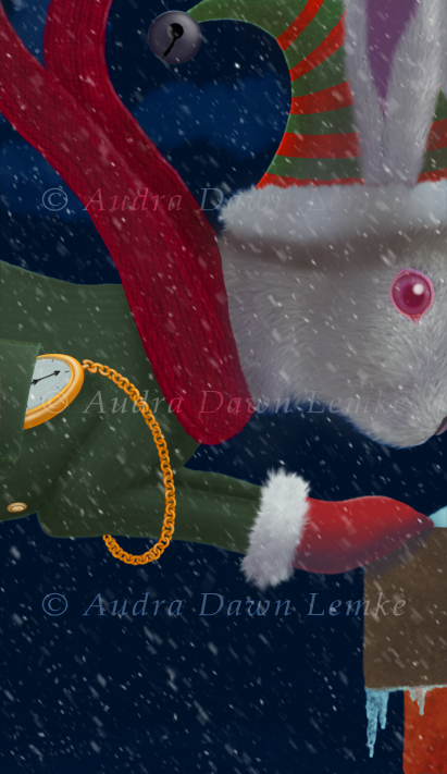 "White Rabbit Christmas" DETAIL IMAGES: "White Rabbit", "Teacup, jingle bell, candy cane" Curiouser and curiouser! A visitor from Wonderland? Digital painting. Created a few vector elements and combined several filters to create snow. (Copyright © 2015 Audra D. Lemke). |