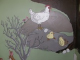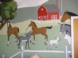 I also created a second, smaller mural under the window near the large mural, plus designed a third one that I never ended up painting...ran out of time. (However, I cleaned up the digital version of this unpainted mural. See my sheep and lamb cartoon artwork that I derived from my unused mural design.). I drew the images for the murals in Photoshop, and then my husband borrowed a data projector from work to project the image onto the walls. I carefully traced my design, maintaining its original details, then painted it.