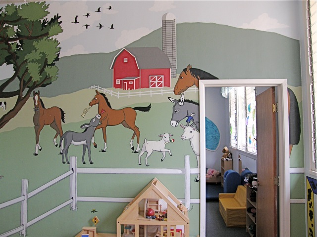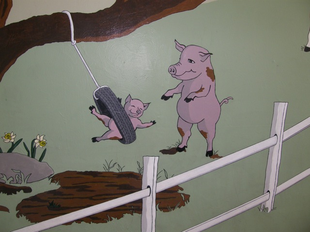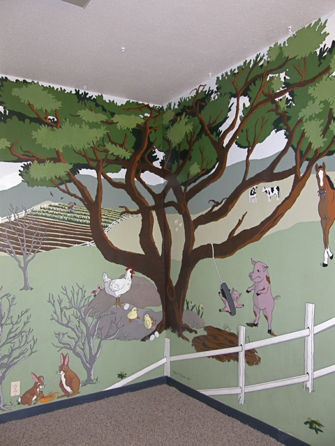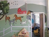 My children both attended a parent participation preschool. The director was looking for someone to help make a "tree" in the circle time area. During the interview with the director, upon joining the school, I offered my artistic skills to paint a cartoon-style mural with the disclaimer that I've never done a mural project. In my usual style, the project turned out to be a large one. It took a long time, since I only chipped away at the project a teeny bit at a time (busy mom). However, I'm proud of the results. We went with a farm theme, including "parent participation" farm animals.