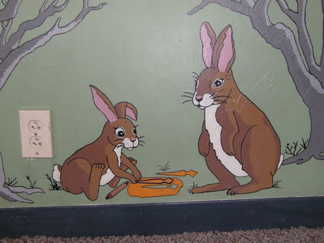 Bunny cutting carrot shapes out of play dough. See my Easter Bunny artwork that I derived from this mural image. |