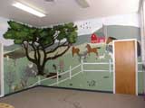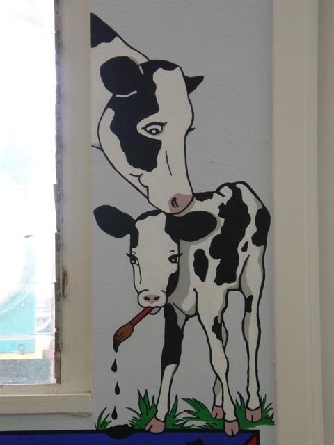 A smaller mural that creates a framed area under the classroom window. A young cow paints cow spots while the parent cow offers encouragement! |