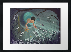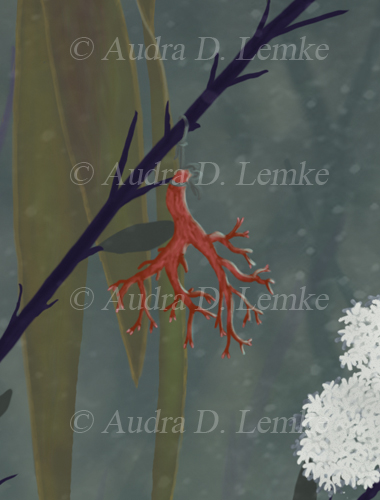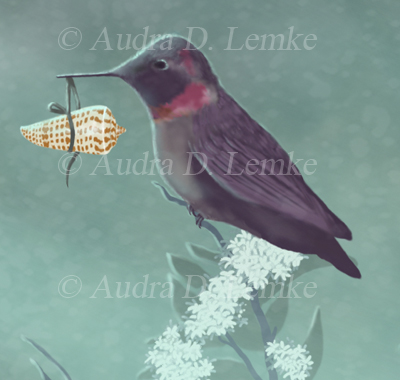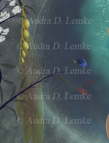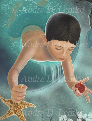 "Keepsakes of the Ocean" DETAIL IMAGES: "Boy swimming out of ocean portal", "Hummingbird collector carrying shell", "Green Bulb Kelp, red fish, and tang", "Moorish idol in small portal bubble", "Dead mans fingers kelp", "Red coral", "Shell: copper spiral", "Shell: cone spiral" A boy emerges from a portal to bring ocean gifts to a collector in the forest. Is the child visiting from a sea far away? Or are the precious ocean keepsakes lost relics from another time? Protect our oceans! (Copyright © 2013 Audra D. Lemke). |