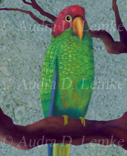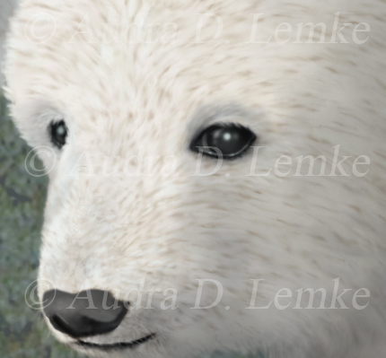 "Not Like Home" DETAIL IMAGES: "Bear 1", "Bear 2", "Parrot" Two polar bear cubs look out of place in this warm, tropical habitat. Inspired by the scientific evidence of melting Arctic sea ice, the home environment of the polar bear. Protect and respect our oceans, our animals, and our planet earth! Digital painting with my own added textures. (Copyright © 2016 Audra D Lemke). |
