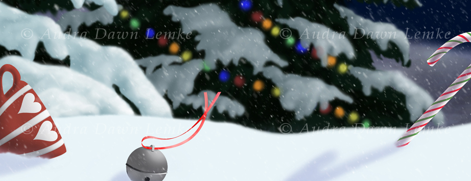 "White Rabbit Christmas" DETAIL IMAGES: "White Rabbit", "Teacup, jingle bell, candy cane" Curiouser and curiouser! A visitor from Wonderland? Digital painting. Created a few vector elements and combined several filters to create snow. (Copyright © 2015 Audra D. Lemke). |