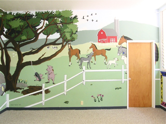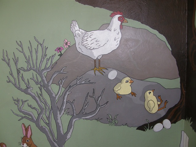 I also created a second, smaller mural under the window near the large mural, plus designed a third one that I never ended up painting...ran out of time. (However, I cleaned up the digital version of this unpainted mural. See my sheep and lamb cartoon artwork that I derived from my unused mural design.). I drew the images for the murals in Photoshop, and then my husband borrowed a data projector from work to project the image onto the walls. I carefully traced my design, maintaining its original details, then painted it.