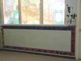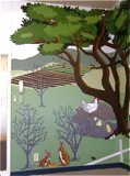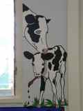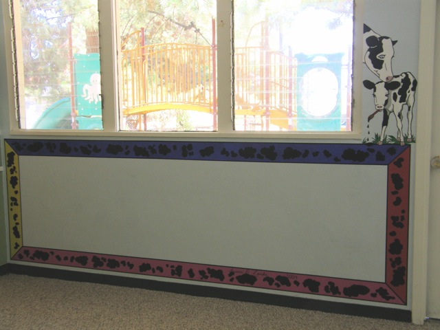 A smaller mural that creates a framed area under the classroom window. A young cow paints cow spots while the parent cow offers encouragement! |