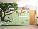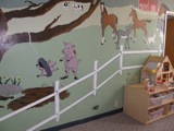 My children both attended a parent participation preschool. The director was looking for someone to help make a "tree" in the circle time area. During the interview with the director, upon joining the school, I offered my artistic skills to paint a cartoon-style mural with the disclaimer that I've never done a mural project. In my usual style, the project turned out to be a large one. It took a long time, since I only chipped away at the project a teeny bit at a time (busy mom). However, I'm proud of the results. We went with a farm theme, including "parent participation" farm animals.