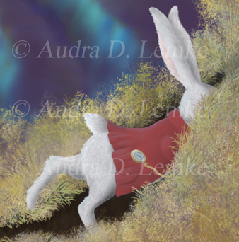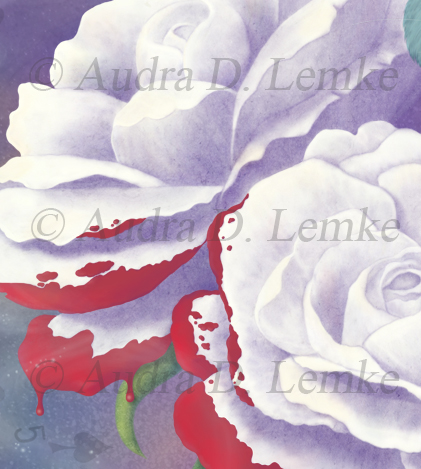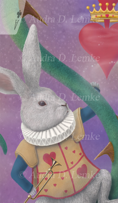 "Painted Roses for Wonderland's Heartless Queen" DETAIL IMAGES: "Cheshire","Roses", "Card, Rose, Ghostly Suits","Rabbit and 'Queen of Hearts'" At the Queen of Hearts' garden, Alice met three card gardeners (Five, Two, and Seven of Spades) who curiously were painting white roses red. They had planted a white rose-tree instead of a red one, as expected by the Queen, and feared that she would cry "off with your heads!" Shortly afterwards, the Queen of Hearts arrived with her procession, including the White Rabbit. A croquet game is started, and the Cheshire Cat's head appeared above Alice. In this interpretation of the garden scene, the Queen of Hearts's wrath destroys card after card and leaves a trail of ghostly suits - clubs (soldiers), diamonds (courtiers), and spades (gardeners), but sparing the royal children (hearts). In the book, Alice saves the three gardeners, but here the Queen sends ghostly 5, 2, and 7 of Spades billowing away. The Cheshire Cat appears in the sky, grin first, and remaining partially transparent. The White Rabbit stays by the Queen as her herald. (Copyright © 2011 Audra D. Lemke). |