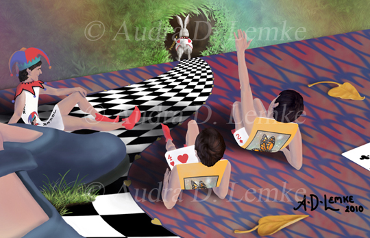 "Flying Cards Dissolve Alice's Dream" DETAIL IMAGES: "Alice", "Human Cards and White Rabbit" The Queen shouts "Off with her head!" The pack of cards come flying down upon Alice. Her dream is ending. The cards and Wonderland are transforming (Copyright © 2010 Audra D. Lemke). |